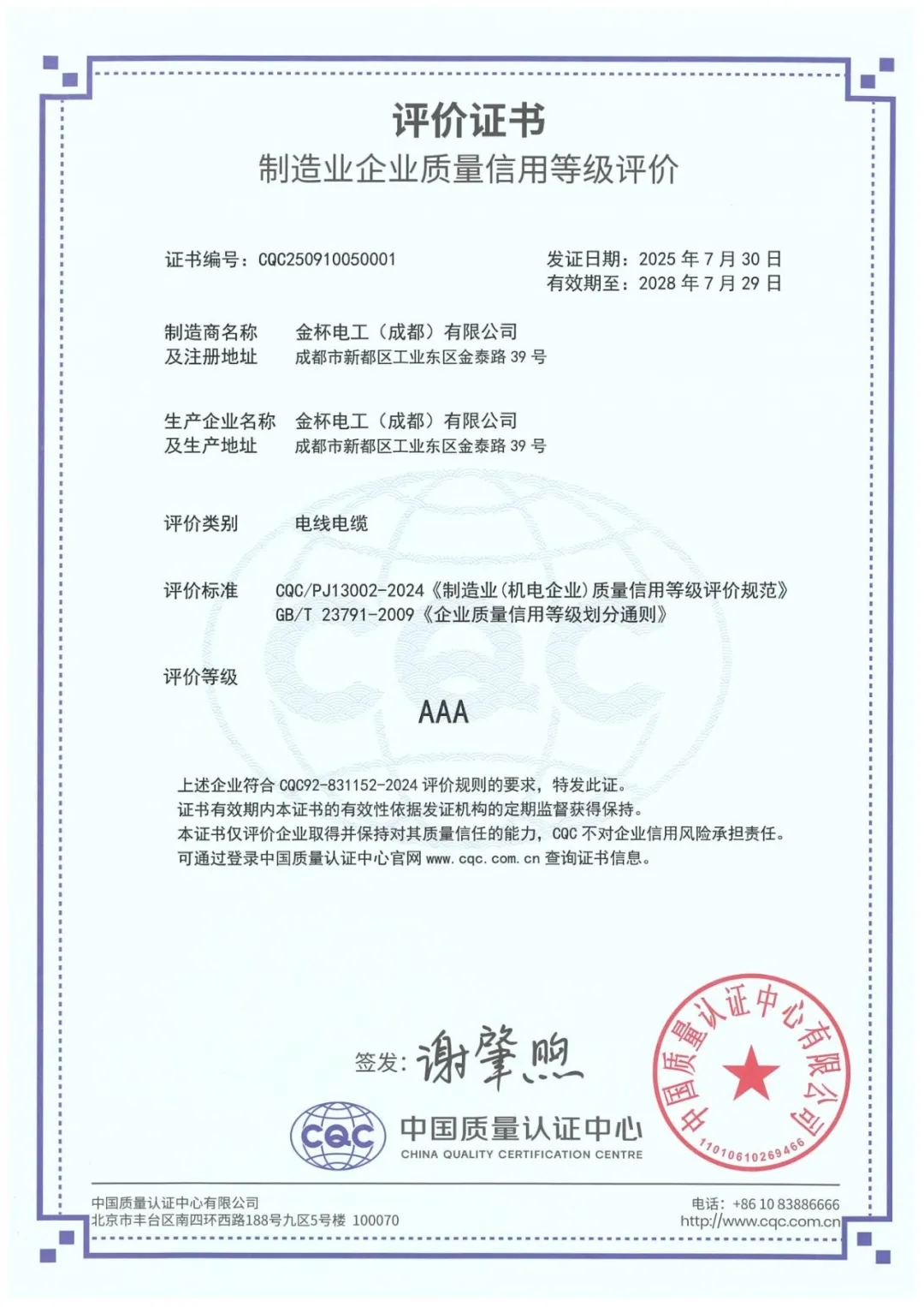 近日,金杯電工(成都)有限公司憑借卓越的產(chǎn)品質(zhì)量和嚴格的質(zhì)量管理體系,榮獲由中國質(zhì)量認證中心頒發(fā)的川內(nèi)首張AAA級制造業(yè)企業(yè)質(zhì)量信用等級評價證書。